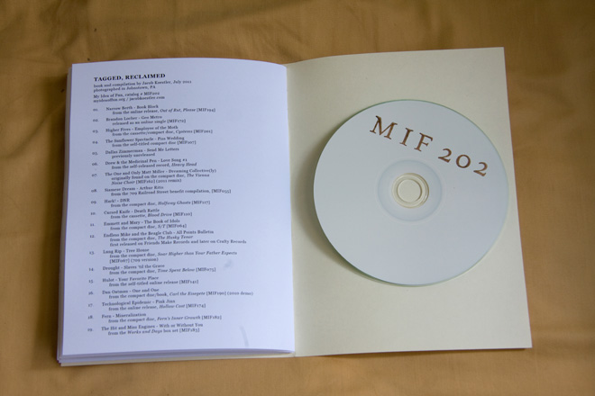 Artist: Jacob Koestler Title: Tagged, Reclaimed Release #: MIF202 Format: Book / CD Release Date: August 2011 Edition of: 12 Details: 36 pages, 5.5" x 7", soft cover, hand stamped, includes CD book and compilation by Jacob Koestler, July 2011 photographed in Johnstown, PA 01. Narrow Berth - Book Block